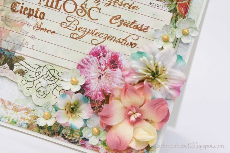 W roli głównej cudny papier firmy Annalee, w piękne, delikatne wzory pasków i róż. Do tego trochę kwiatów i perełek, od których trochę się uzależniłam:D. No i jeszcze rub-onsy, które użyłam pierwszy raz - też przypadły mi do gustu:).